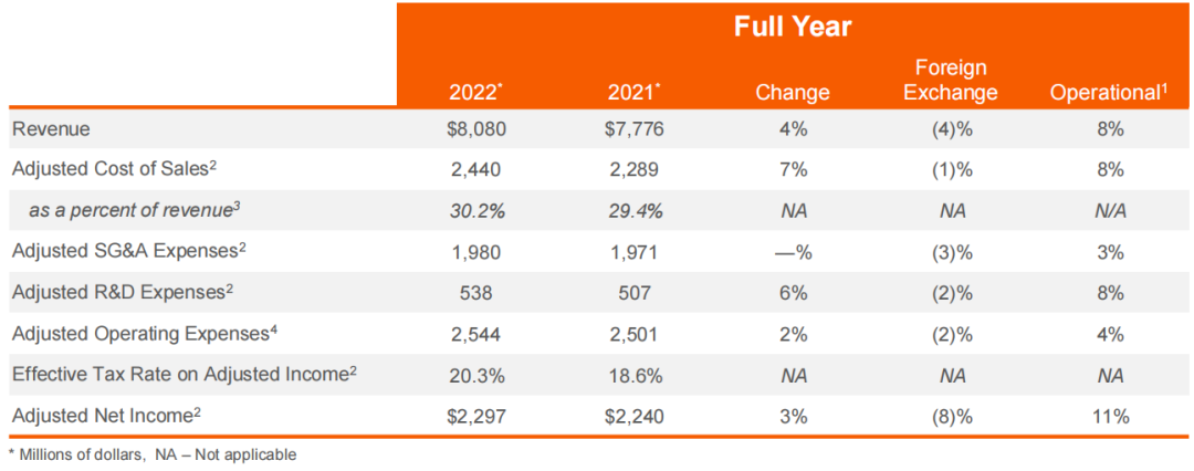 2022年,硕腾公司全年总收入为81亿美元,同比增长4%(2021年总收入为78亿美元),调整后净收益23亿美元,调整后的摊薄每股收益4.88美元,分别增长3%和4%。运营支出方面,公司全年调整后销售成本为24.4亿美元,同比增长7%,占总收入的30.2%;调整后的SG&A费用为19.8亿美元,同比持平;调整后的研发费用为5.38亿美元,同比增长6%。