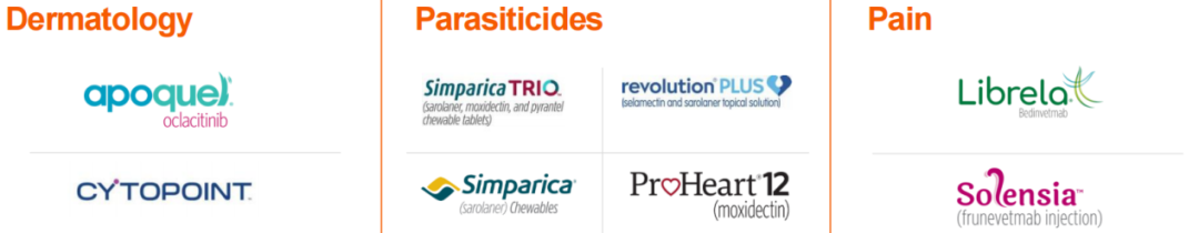 抗寄生虫药物:ProHeart(莫西菌素)是目前唯一获得FDA批准用于预防犬心丝虫病的注射剂,只需由兽医注射1针,即可获得1整年的保护力,该产品也可用于治疗钩虫感染。Revolution(大宠爱)主要活性成分为赛拉菌素,是一种针对宠物猫和狗的体外抗寄生虫药物,主要防止跳蚤、丝虫、耳螨等,还可控制蜱虫、蛔虫和钩虫等。Revolution Plus的主要成分在赛拉菌素的基础上增加了沙罗拉纳,因此可在Revolution的基础上增加针对黑腿蜱、墨西哥湾沿岸蜱的防护以及额外的跳蚤控制。Stronghold主要活性成分是塞拉菌素,是一种针对猫和狗的体内抗寄生虫药物,可用于预防和治疗跳蚤、丝虫、耳螨、蛔虫、钩虫、虱子等。Simparica(欣宠克)主要成分为沙罗拉纳,可用于预防和治疗犬的跳蚤和蜱虫感染。Simparica Trio(沙罗拉纳,莫西克汀和噻嘧啶咀嚼片)主要用于犬的肠道蛔虫、钩虫及心丝虫的预防,以及体表跳蚤和蜱虫的控制,是首个三重组合式犬抗寄生虫药物。