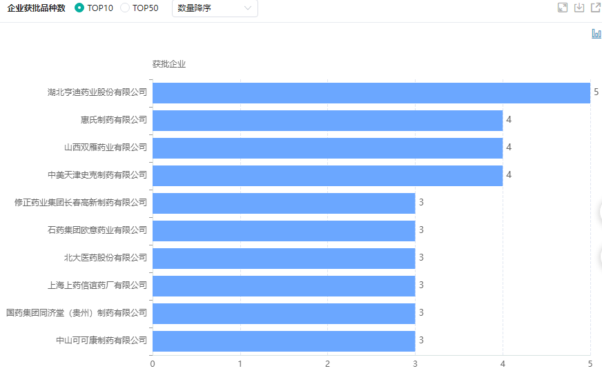 药融云中国药品批文数据库显示,目前国内布洛芬有659个在使用的生产批准文号,涉及52个品种,410家企业;其中,布洛芬片就有277个批文,占比42%;其次是酮洛芬肠溶胶囊与布洛芬胶囊,分别有45个、31个。从企业获批品种数来看,TOP5企业分别是亨迪药业、惠氏制药、双雁药业、中美史克、修正药业。