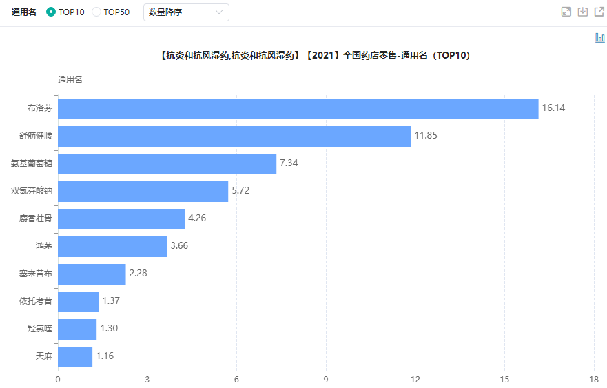 药融云全国药店零售数据库显示,2021年零售药店终端市场抗炎和抗风湿药物TOP10通用名品种中,有4个属于非甾体抗炎药物;其中,布洛芬的销售额遥遥领先位居榜首,销售额达到16.14亿元,市场份额为22.3%;其次是双氯芬酸钠、塞来昔布、依托考昔,销售额分别为5.72亿元、2.28亿元、1.37亿元。