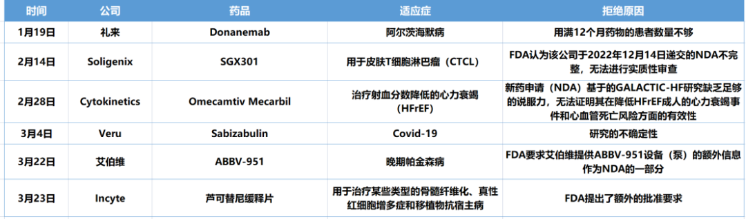 2023年第一季度,有6款新药上市申请收到了FDA发出的完整回复函(CRL),而被拒理由绝大多数集中于对产品有效性和安全性的质疑上,包括临床获益存疑、临床数据单一等问题。