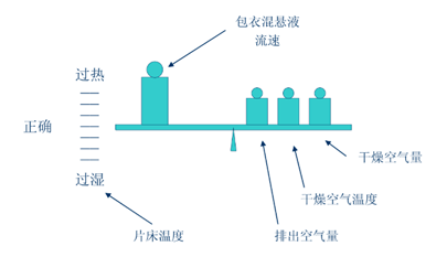 (5)片床温度:片床温度过低会易造成桥架问题;而片床温度太高又会造成包衣膜破裂和剥离问题。一般包衣过程中通过测量和控制片床温度或者出风温度来调节包衣条件的,如果想建立一个合适的包衣条件,还是要平衡好进风温度、进风风量和出风量三者之间的平衡。要根据片剂的稳定性选择合适的进风风量和进风温度以保持片床温度或出风温度。