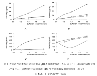 例如有文献先是研究了尼美舒利在四种不同PH介质中加入不同种类表面活性剂中的平衡溶解度和溶出曲线,结果显示在pH1.2盐酸溶液、pH6.8磷酸盐缓冲液和纯化水介质中,加入SDS、CTAB或吐温均可以提高其溶解度,其中CTAB的增溶效果最好,SDS和吐温的增溶效果相当,但都不及CTAB,可能是弱酸性尼美舒利在溶液中解离成阴离子型,更容易与CTAB作用,从而导致增溶效果最好。