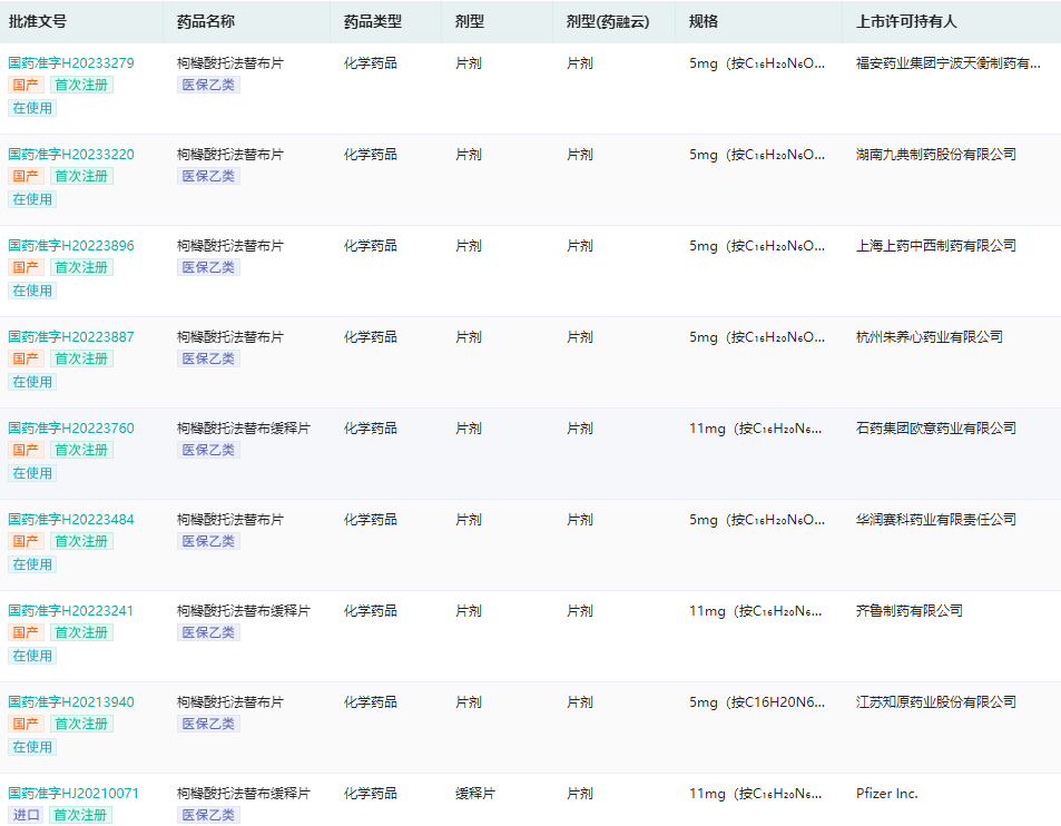 国产托法替布片获批产品查询(部分)