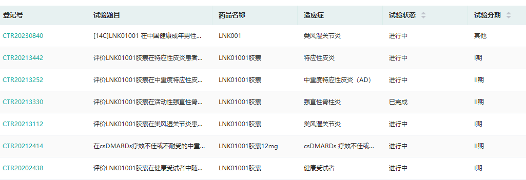 同时,LNK01001是凌科药业研发的一款用于治疗自身免疫性疾病的1类新药,目前针对类风湿关节炎以及强直性脊柱炎、特应性皮炎的临床Ⅱ期研究也正在进行中。