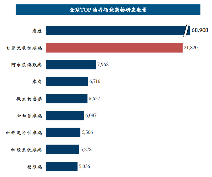 JAK-STAT信号通路与多种自身免疫性疾病的发病机制相关,包括类风湿关节炎、银屑病和炎症性肠病等。据药融云数据库统计,自身免疫性疾病为仅次于肿瘤的研发热门领域,中国研发数量位列全球第二梯队(《JAK抑制剂新战场?礼来、辉瑞抢先,国内恒瑞医药、泽璟制药最快!》)。