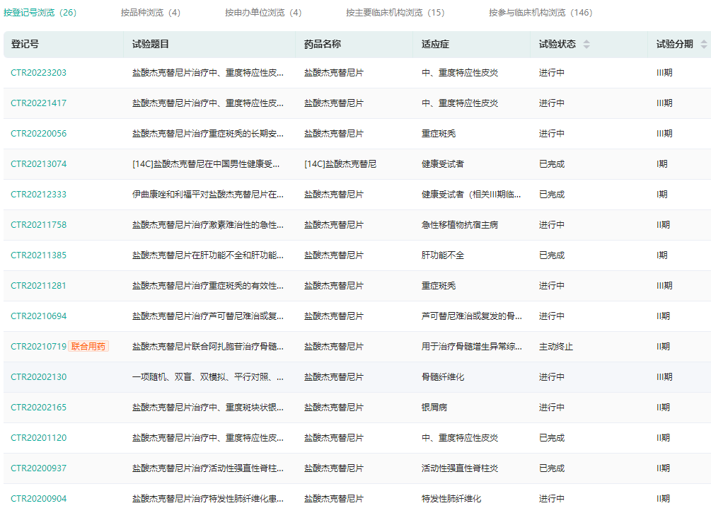 盐酸杰克替尼临床试验信息查询(部分)