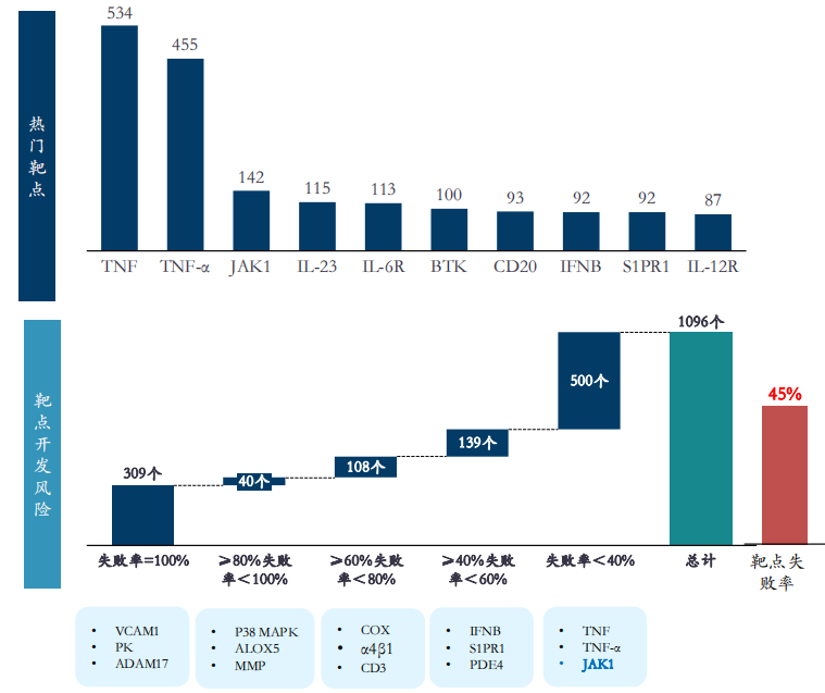 全球自身免疫性疾病TOP10靶点药物研发数量与靶点开发风险分析