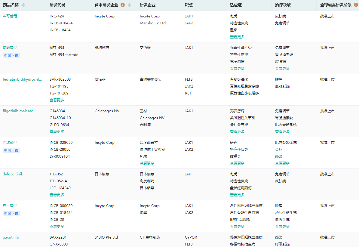 一键查询全球获批上市的JAK抑制剂(部分显示)