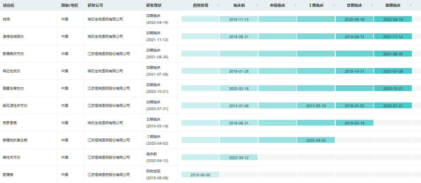 SHR0302是一种高选择性的JAK1抑制剂,可通过抑制JAK1信号传导发挥抗炎和抑制免疫的生物学效应。药融云数据库显示,SHR0302目前已在中国获批类风湿关节炎、白癜风、溃疡性结肠炎、克罗恩病、强直性脊柱炎、特应性皮炎、银屑病关节炎等多项临床试验研究;其中斑秃、特应性皮炎、溃疡性结肠炎、类风湿性关节炎、强直性脊柱炎等处于临床III期,克罗恩病处于临床II期。
