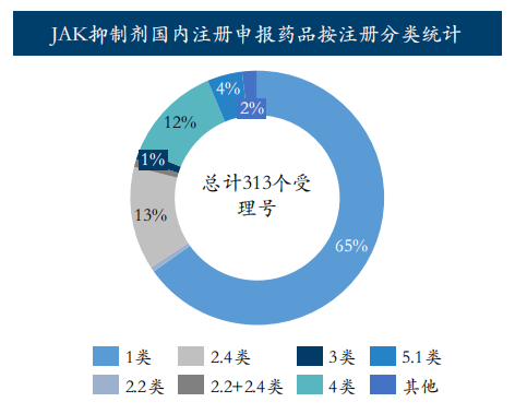据药融云数据库统计,目前国内注册申报JAK抑制剂:涉及60个品种,313个受理号,其中1类新药占比达65%。按剂型统计,片剂的药品数量最多有37个,其次是胶囊剂。