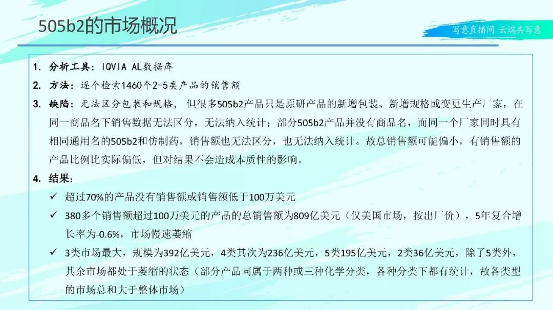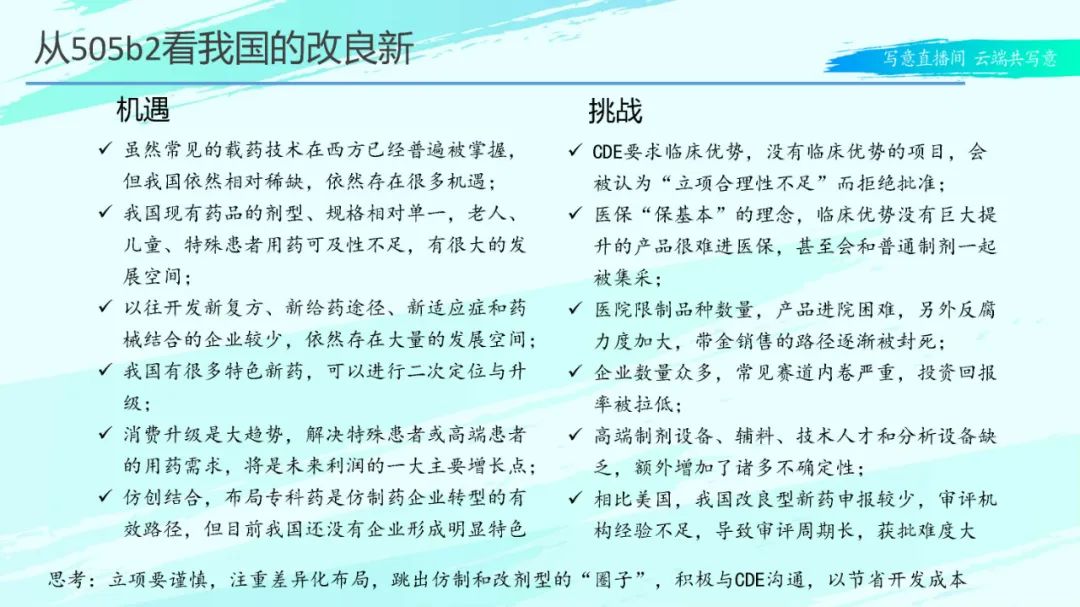 近年来,仿制药企业出海和转型是非常热门的话题,而无论出海与转型,都避不开505b2,尤其了最近一两年来,505b2、改良型新药变得炙手可热。然而不论改良型新药还是505b2,都是机遇与挑战并存,最终都只有少数企业能够走通,所以下好第一步棋显得非常关键。本报告是3月份,本人在同写意线上平台上做的报告,现把PPT分享给各位同仁,希望对大家有所帮助。