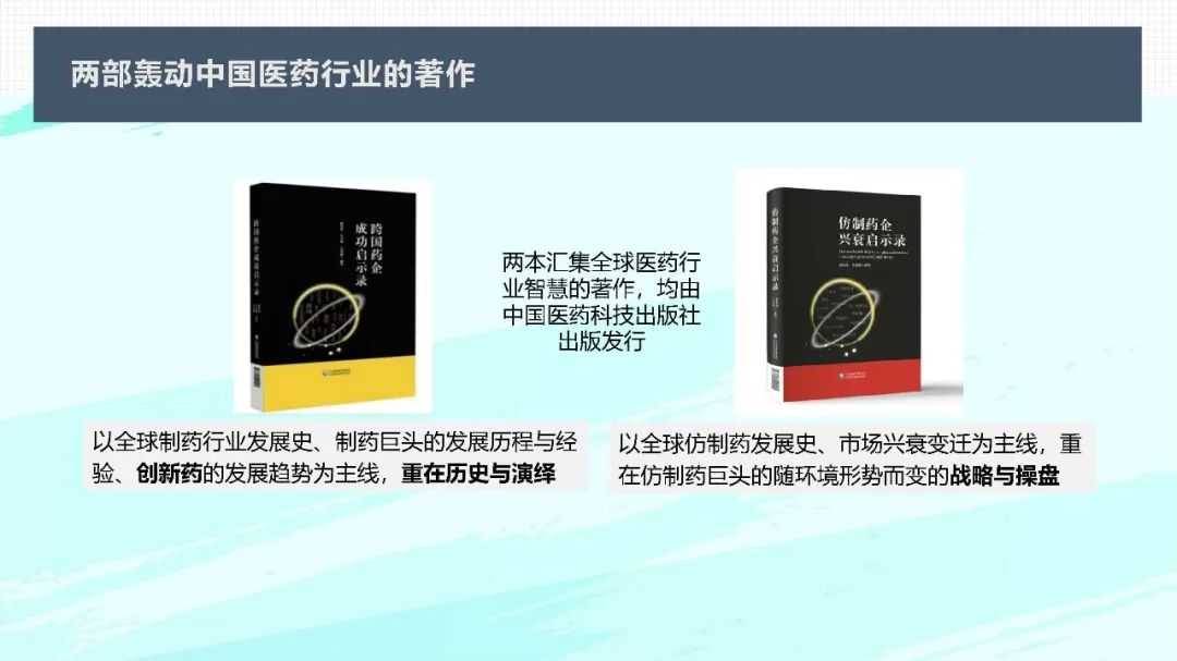 魏利军,副主任药师,北京药眼信息咨询有限公司创始人兼CEO,前哈药集团产品战略总监、立项部总监。2015年开始从事产品分析立项、产品线规划布局工作,现已完成上百个项目的立项和数十个产品线的规划、优化工作。2017年以来,先后在《药学进展》《中国新药杂志》《中国食品药品监管》《科学大观园》《中国医药报》《医药经济报》等出版物上发表了数十篇行业研究性文章,也参与了《2019年中国药品蓝皮书》的编写,代表著作为《跨国药企成功启示录》和《仿制药企业兴衰启示录》。