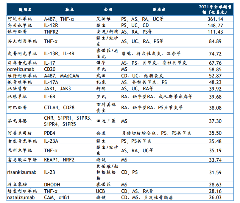 一、自身免疫性疾病药物,2021年全球销售额贡献位列第一