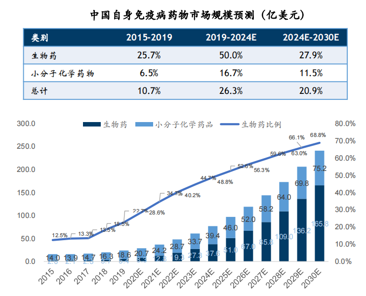 中国自身免疫性疾病市场中,生物药的份额预期将由2019年的22.7%增加至2030年的68.8%。