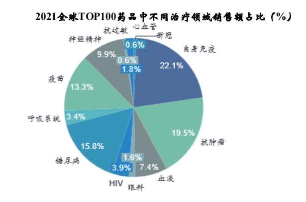 据药融云数据统计,2021年全球销售额TOP100药品中有21个为自身免疫性疾病药物,数量仅次于抗肿瘤药。