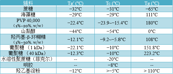保证稳定性的重要因素是稳定剂和蛋白质之间的适当比例。糖和蛋白质之间的摩尔比应至少为360:1【3】。添加过量糖会降低Tg'。优化冻干过程的方法是选择具有高稳定性效果和高临界温度Tǵ和Tc的替代辅料,高于蔗糖和海藻糖。包含具有高Tg'和Tc改性剂的辅料,允许产品在更高的干燥温度下进行初级干燥而不会破坏产品结构。此外,Tc改性剂和填充剂通过形成晶格的组合可以在产品温度高于Tc的情况下进行初级干燥,而不影响蛋白质稳定性和不发生塌陷【4】。下表列出的稳定剂辅料(除山梨醇外)Tg'都高于蔗糖(这意味着可能使用更高的干燥温度来缩短干燥过程)。为了确保蛋白质的稳定性并防止相分离,建议将蔗糖和葡聚糖结合使用【2】。