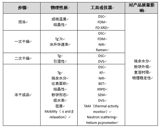 二次干燥通过解吸去除未冷冻的结合水,以避免储存期间出现蛋白质稳定性问题。为了避免样品崩溃,应逐渐提高板层温度,一般不超过50°C,时间通常不超过6h。干燥结束后,产品中的残留水分为应符合要求。根据QbD原则,过程分析技术的主要目的是提高过程效率并保证产品的关键质量属性。近年来,已经开发出用于在线和实时测量的新工具,如温度远程监控系统和TrackSense Pro系统,基于对产品温度、板层温度和腔室压力的监控,可以确定一次干燥甚至二次干燥的终点。LyoTrack系统基于光学发射光谱测量干燥室内的水分浓度,从而获得更准确的干燥终点。压力温度测量是一种压力上升测试,当干燥室中的蒸汽压力不再上升时,初级干燥完成。此外,通过使用近红外和拉曼探头,可以监测冻干配方的中间参数,例如过程诱导的转变、结晶、固态化、多晶型转化和残余水分含量。过程分析技术工具以及相应的属性如下表。
