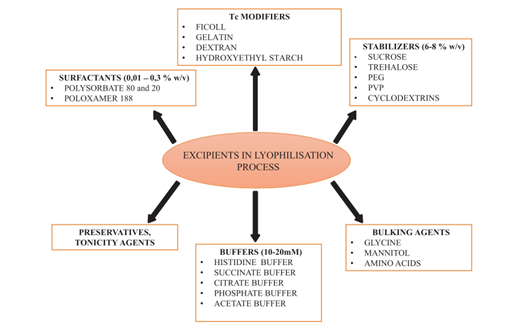 选择合适辅料能有助于产品在冻干过程中获得理想的质量属性和稳定性,并降低生产的时间和经济成本,提高产量。下图为生物药冻干制剂常用辅料选用: