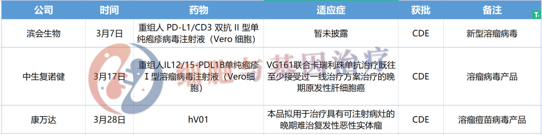 溶瘤病毒产品临床试验获CDE受理3月盘点