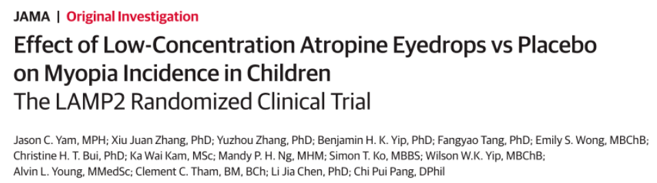 不过,近日一份研究引起业内广泛关注。今年2月份,香港中文大学眼科团队在JAMA发表题为“Effect of Low-Concentration Atropine Eyedrops vs Placebo on Myopia Incidence in Children”的研究称: