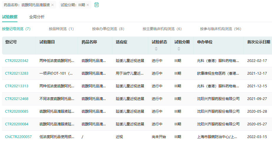 经摩熵医药中国临床试验数据库查询,兆科眼科、沈阳兴齐眼药和欧康维视的硫酸阿托品滴眼液进展最快,已到临床III期阶段,国产首家最有可能从这三家药企中决出,一旦获批,国内患者就可采用低浓度阿托品控制近视,7亿患儿将迎来福音;博瑞制药、杭州赫尔斯科技已完成I期临床;艾尔健康眼药、齐鲁制药和参天制药的I期临床正在进行中。