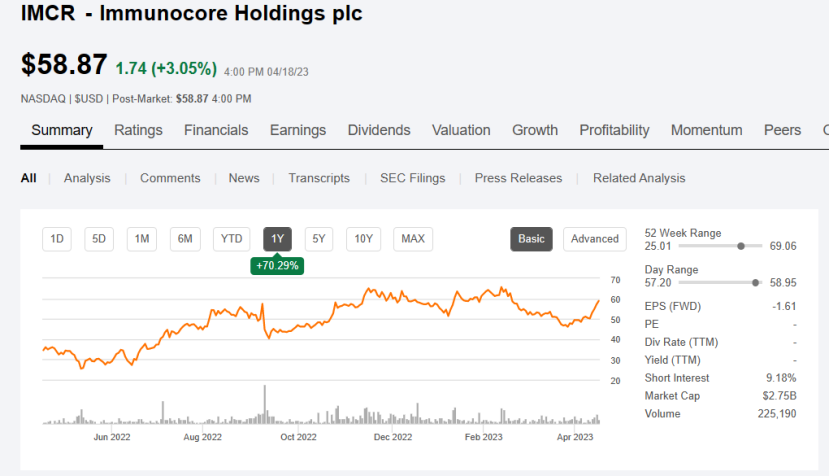 2021年2月5日,Immunocore在纳斯达克上市,发行价26美元,目前股价为58.87美元,市值达27.5亿美元,已成为TCR细胞疗法领域的龙头企业。