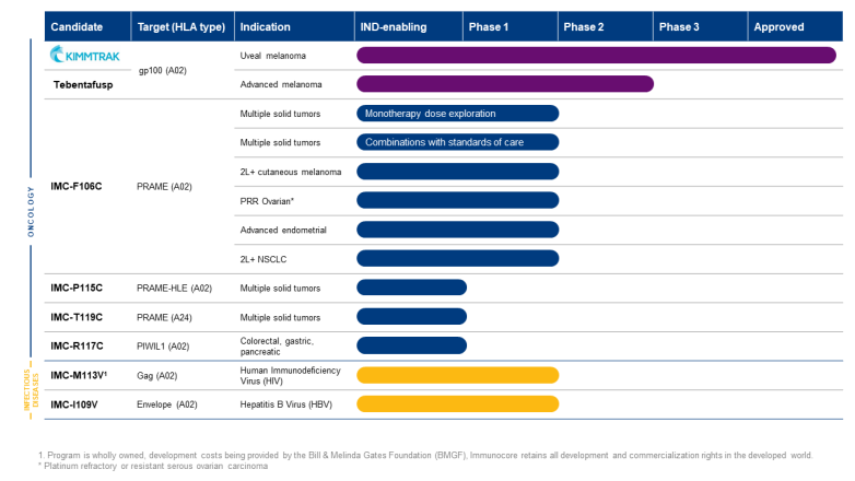 Immunocore率先开发了一种名为ImmTAX的新型TCR双特异性免疫疗法,并利用其专有的、灵活的、现成的ImmTAX平台,正在开发多个治疗领域的深层管线,包括肿瘤学和感染性疾病的五个临床阶段项目,自身免疫性疾病的高级临床前项目和多个早期临床前项目。公司最先进的肿瘤TCR细胞疗法——KIMMTRAK已经获批上市。