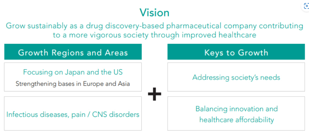 更新的SGS2020中的基本策略:增长地区:以日本和美国为重点,同时加强在欧洲和亚洲的实力;增长领域:感染性疾病,疼痛/中枢神经系统疾病。