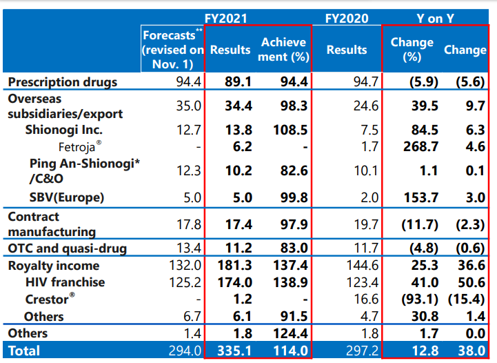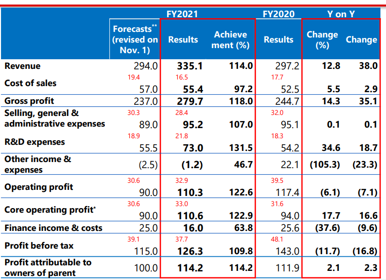 2022年5月11日,盐野义制药公布2021年年度财务报告:全年营收额3351亿日元(25.5亿美元),同比增长12.8%;核心营业利润1106亿日元(8.4亿美元),同比增长17.7%;研发费用730亿日元(5.5亿美元),同比增长34.6%。