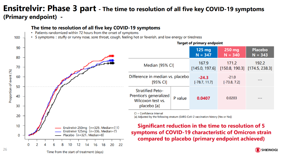 在该人群中,与安慰剂相比,接受低剂量ensitrelvir(在日本提交批准的剂量水平)治疗的患者首次缓解五种COVID-19症状(鼻塞或流鼻涕、喉咙痛、咳嗽、发热或发烧、精力不足或疲倦)的中位时间显著缩短:167.9vs192.2小时,24小时差异显示统计学显著性(p=0.04)。