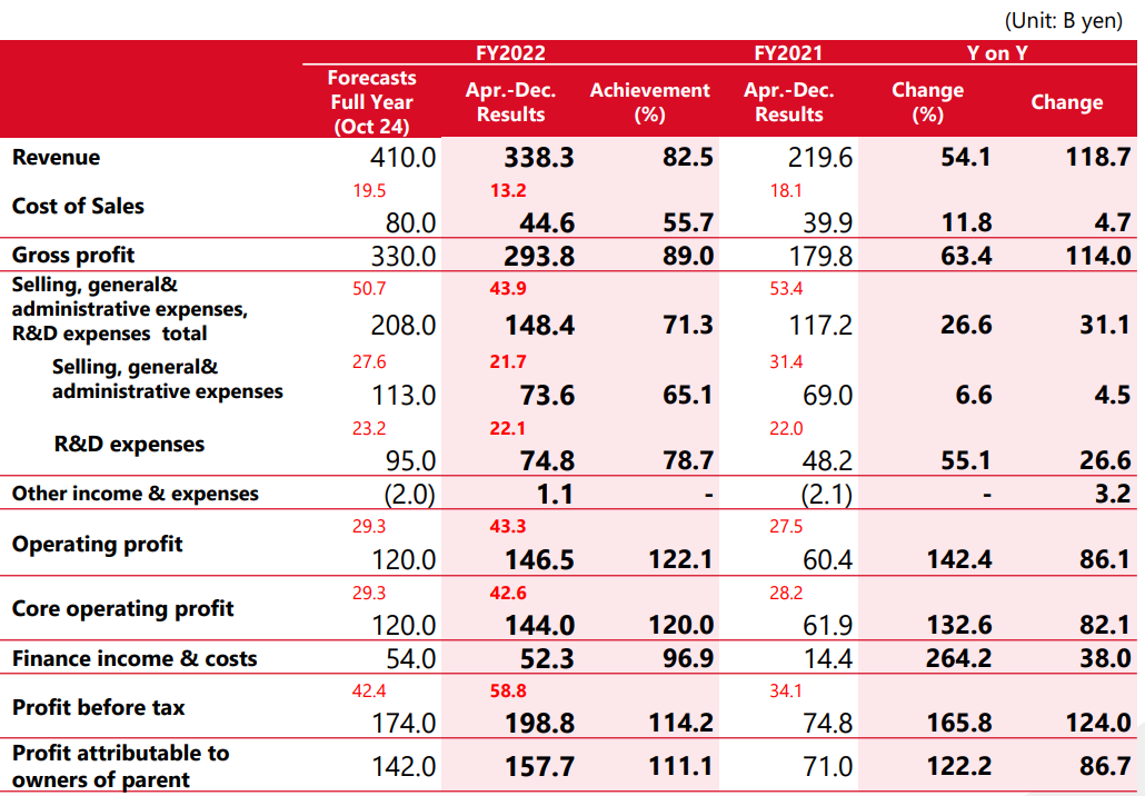 2023年1月30日,盐野义公布2022财年第三季度报。2022财年第三季度营业收入为3383亿日元(25.7亿美元),同比增长54.1%。核心营业利润1440亿日元(10.9亿美元),同比增长132.6;研发费用投入总计748亿日元(5.7亿美元),同比增长55.1%。