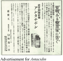 1909年,推出第一款新药:Antacidin。Gisaburo次子Chojiro毕业于东京帝国大学医药学部制药专业之后,盐野义开始进行全面的制药研究。当时,该会社的一位监督药剂师从大阪府立医学校的一位儿科首席医师那里得知了一种抗胃酸剂的处方,该处方是从一本德国药学书中引用的。Gisaburo开始制造这种抗酸剂的试验品,并成功地生产出了市场销售的产品。这种新型抗消化不良药物Antacidin是盐野义公司推出的第一款自主创新药物。
