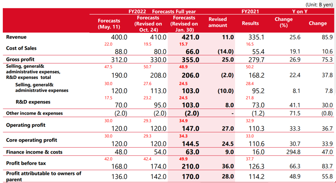 盐野义制药预计,2022财年全年营收同比增长25.6%,达到4210亿日元(32亿美元);核心营业利润达到1470亿日元(11.2亿美元);预计投入研发费用总计2060亿日元(15.7亿美元)。