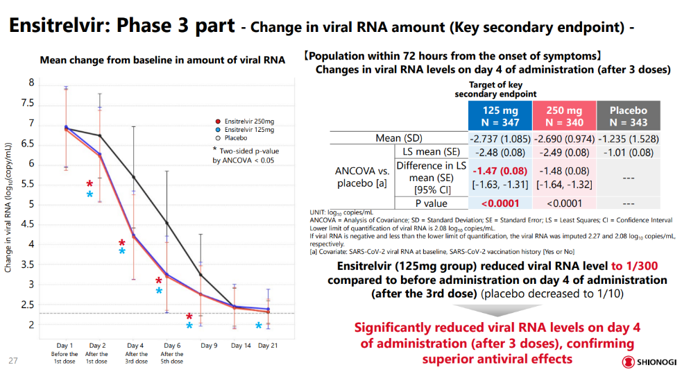 IIa期结果显示,在抗病毒方面,与安慰剂组相比,S-217622组能够实现病毒滴度和病毒RNA的迅速下降。IIb期在日本和韩国招募了428名患者,随机接受安慰剂和ensitrelvir的高低两种剂量治疗。