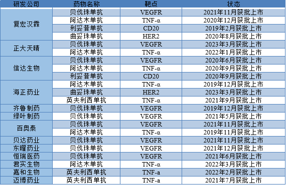 生物制药特点之一就是药品价格相对昂贵,经济发展较差地区难以负担。2005-2019年间已有55种生物类似药在欧盟(EU)市场获得批准,其中包括生长激素、促红细胞生成剂(ESA)、粒细胞集落刺激因子(G-CSF)和单克隆抗体。欧洲药品管理局(EMA)于2010年3月允许批准符合FDA许可的原研药的生物类似药。2015年9月,FDA批准了美国第一个生物类似药,Sandoz公司的filgrastim(Zarxio®)。2016年4月,FDA批准了第一个生物类似药单克隆抗体,Celltrion公司的英夫利昔单抗(Inflectra®)。2019年2月国内首个上市生物类似药汉利康(利妥昔单抗)(复宏汉霖)获批上市。下表为国内生物类似药上市情况及药物名靶点。