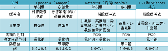 Bioceuticals公司开发出了不含HSA促红细胞生成素处方,该处方含有氨基酸(甘氨酸、亮氨酸、异亮氨酸、苏氨酸、谷氨酸和苯丙氨酸)、络合剂(氯化钙)、渗透压调节剂(氯化钠)、磷酸盐缓冲液和表面活性剂(PS20)。因此Bioceuticals公司也与辉瑞公司Hospira签订了独家协议,在美国和加拿大开发、生产和销售促红细胞生成素,Retacrit®(Amgen公司Epogen® 和Procrit®(epoetin alfa)的生物类似药)。Retacrit® 是美国市场上第一款获得批准的Epogen®生物类似药。LG Life Sciences 则使用协同组合稳定剂开发出一种稳定的促红细胞生成素处方,其处方成分为:磷酸盐缓冲液、丙二醇、甘氨酸、氯化钠和PS20。各处方信息如下表。