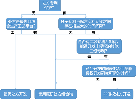 生物药产品的处方很复杂,在开发非侵权替代处方时必须考虑多个变量,这些变量包括分子专利到期与处方专利到期之间的时间间隔、不侵犯其他二级专利以及合理安排项目时间表。生物类似药的开发难点在于工艺、处方和特殊器件的有效二级专利的复杂性。原研公司会利用不同的策略来阻碍生物类似药和后续生物制剂的申报上市,这些策略可能包括为有偿延迟、专利和解、产品更新和收购竞争对手等。处方专利和产品更新是基于处方延迟生物类似药竞争的方法。产品更新是原研公司在现有处方基础上研制新处方,从而提高治疗效果或患者依从性,使到期的专利处方转向新处方。因此生物类似药产品开发的第一步是审查有关分子、工艺和药物产品的知识产权。非侵权处方开发需要来自各方面(知识产权、处方工艺、产品开发和项目管理)的意见。决策如图所示