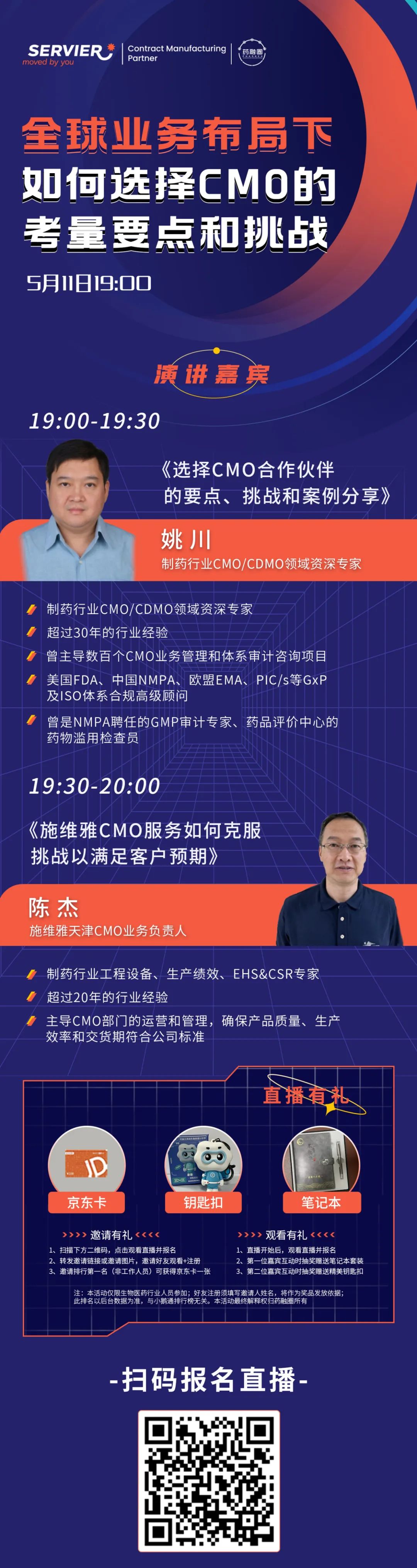 当然,MAH在选择CMO时,还有着更多的考量要点和潜在挑战,不同产品类型所应关注的CMO能力也会有所不同。为了更加深入的探究,药融圈联合施维雅共同邀请到来自CHEMPHARM和施维雅的专家共同开展以“全球业务布局下如何选择CMO的考量要点和挑战”为题的线上直播讨论。特邀制药行业CMO/CDMO领域资深专家姚川以及施维雅天津CMO业务负责人陈杰,于与各位线上相聚,分享CMO合作伙伴该如何选择的经验和方法。