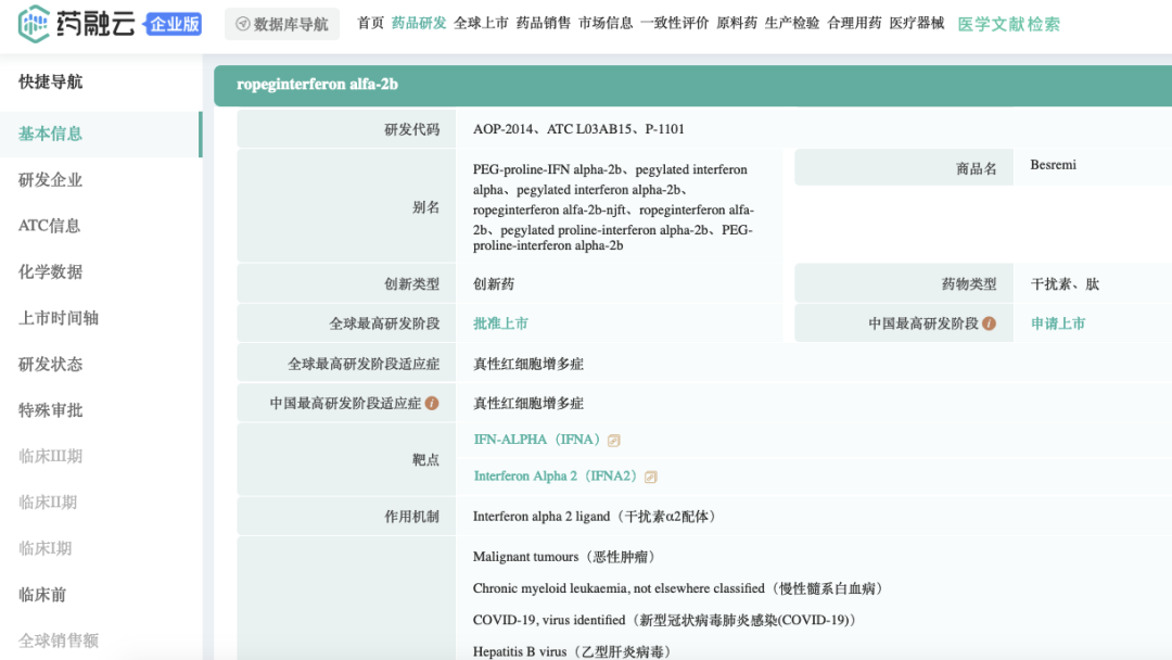 药融圈旗下药融云数据库www.pharnexcloud.com/?mh显示:2023年2月,药华医药股份有限公司(以下简称“药华医药”)(Pharma Essentia)的长效干扰素Besremi(ropeginterferon alfa-2b)(Ropeg,P1101)上市申请获中国药品监督管理局(NMPA)受理,此前已被纳入优先审评。该药物于2019年2月、2021年11月相继获EMA、美国FDA批准治疗真性红细胞增多症(Polycythemia Vera,PV)。