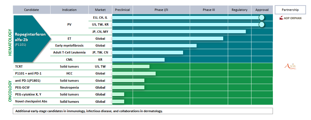 本品为新一代单点聚乙二醇化IFN-α-2b,其特点是比传统PEG-IFN-α半衰期更长,可两周注射一次。由于其良好的安全性及有效性,改变了PV的治疗范式,并因其广泛的适用性。Besremi(ropeginterferon alfa-2b)还将在未来通过单一和联合疗法进一步拓展至其他血液、肿瘤及免疫学疾病上。相关专利:WO-2009023826(技术平台PEGylation开发长效蛋白药物)