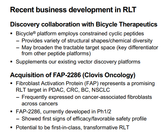 2023年3月,诺华获得德国3B Pharmaceuticals的FAP靶向肽技术包括FAP-2286治疗药物治疗和成像应用的开发和商业化独家许可权益,3BP保留FAP靶向肽技术用于诊断目的开发权益。