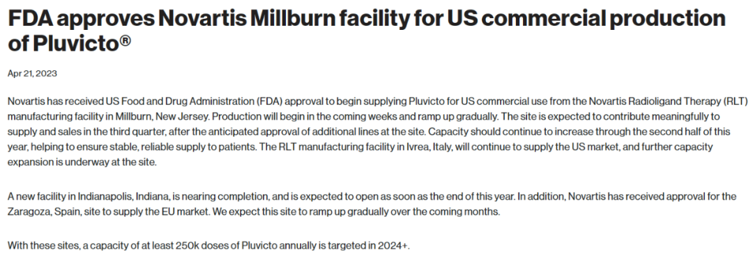 诺华预计到2025年可以实现25万剂年产能:美国FDA已批准其在新泽西州米尔本的工厂生产放射性配体疗法Pluvicto,供美国市场使用,产能预计会在今年下半年得到大幅提升。