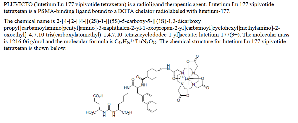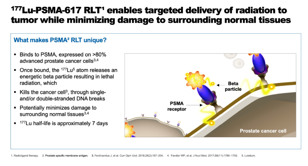 本品的治疗原理:Pluvicto是一种静脉注射的放射配体疗法,该疗法将一种靶向PSMA的小分子化合物与治疗性放射性核素镥-177结合起来。进入血液后,Pluvicto与表达PSMA的前列腺癌细胞结合,放射性核素释放的辐射能量会破坏肿瘤细胞并引发其凋亡。