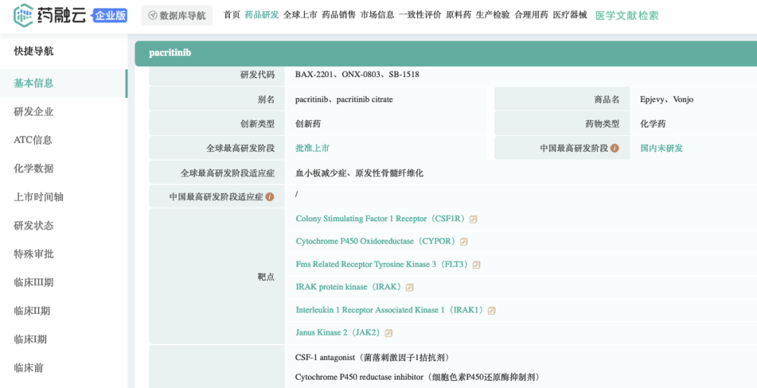 pacritinib药物研发信息(部分,完整内容请登录“药融云数据库www.pharnexcloud.com/?mh”查看)