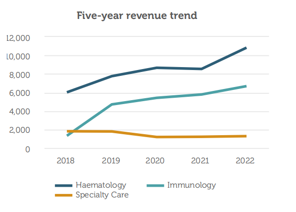 2022年总收入达187.9亿瑞典克朗,与2021年相比增长21%。其中,血液学领域收入达108.31亿瑞典克朗,比上一年增加27%,收入主要来自药物的销售、为辉瑞生产ReFacto AF/Xyntha的原料药的费用以及赛诺菲销售Eloctate和Alprolix的特许权使用费;免疫学领域收入总计66.79亿瑞典克朗,比上一年增加16%。收入主要来自药品的销售;专科护理的收入为12.8亿瑞典克朗,比上一年增加了6%。