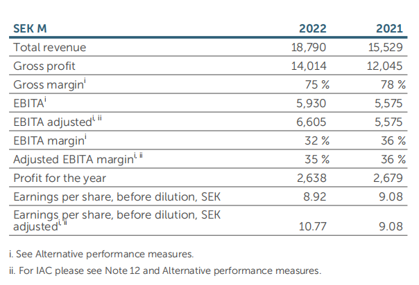 2022年毛利润为75%,营业利润为38.13亿瑞典克朗,增长了2%;EBITA为59.30亿瑞典克朗,增长了6%,调整后的EBITA为66.05亿瑞典克朗,不包括6.75亿瑞典克朗的IAC,EBITA调整后的利润率为35%;2022年度利润总额为26.38亿瑞典克朗;经营活动产生的现金流为46.65亿瑞典克朗,相比上年减少了15%。
