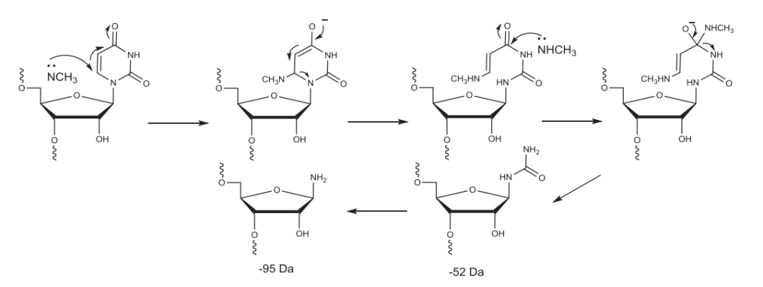 使用甲胺的RNA的C&D中,甲胺与尿嘧啶发生反应导致比FLP小52 Da和95 Da杂质的产生。