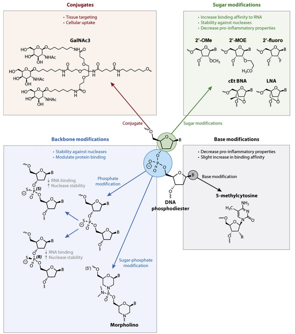 未经修饰的寡核苷酸进入人体后容易被核酸酶降解,并显示出不利的细胞摄取和生物分布。寡核苷酸上通常被修饰的位置有磷酸骨架(如硫代磷酸酯键PS等)、核糖(如2′-OMe、2′-F以及核酸糖LNA等)、嘧啶碱基(如5′-甲基胞嘧啶等)以及靶向配体(如GalNAc等)的添加。研究表明,核糖的2'化学修饰(如2′-OMe、2′-F以及2′-MOE等)能降低核酸酶降解小核酸药物的能力,同时也显著降低了TLR-3/7/8识别小核酸药物为外源性核酸的能力;并大大提高了核酸的稳定性和整体半衰期。PS修饰虽然些微降低了小核酸和靶序列结合的亲和力,但它提高了寡核苷酸在血液和组织中的核酸酶抗性。由于氧原子被硫原子取代额外引入了一个手性中心,每个PS键上存在两个立体异构体(Rp结构和Sp结构)。当一种构象可被核酸酶降解时,另一种构象往往表现出较强的核酸酶抗性。同时,PS的电子云往往比PO更加分散,从而导致更多的疏水性。这一性质起到了促进蛋白质结合并延长血浆半衰期的作用,但非特异性的蛋白质结合能力往往也导致毒性,因此PS修饰的数量往往在成药性研究中被严格控制。LNA以及cEt和tc-DNA修饰涉及糖环的桥接,它们各自促进RNA样结构,显示核酸酶抗性,最重要的是,显著增加了和靶序列结合的亲和力。