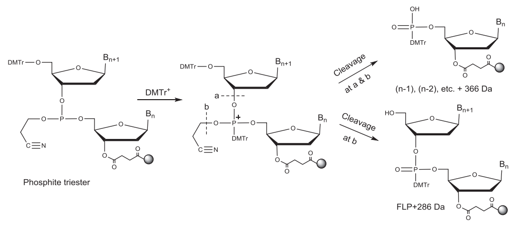 偶联反应后新加上的核苷酸通过亚磷酯键(三价磷)与CPG上的寡核苷酸链相连。亚磷酯键不稳定,易被酸、碱水解,在下一个循环的脱保护酸性环境中不稳定,因此需要被氧化成稳定的五价的磷。磷酸二酯键中的2-氰乙基保护基团可以使其在后续合成中更稳定。常用的氧化剂为碘的四氢呋喃//吡啶/水溶液。此外通过将一个硫原子转移到P(三价)上也可以将其转化为P (五价),从而形成硫代磷酸酯键。在合成同时含有磷酸二酯(PO)键和硫代磷酸酯(PS)键的寡核苷酸时,此步中使用的氧化试剂可以将已形成的PS键氧化为PO键,得到比FLP少16 Da的杂质。不完全的氧化/硫化中的亚磷酸酯键与后面脱保护形成的DMT阳离子反应产生两种对酸稳定的杂质。一种杂质比N-1多366 Da,另外一种杂质比FLP多286Da。
